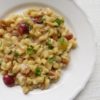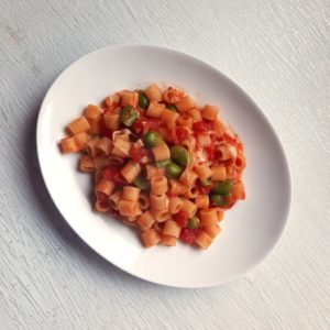 Wenn wir schon bei Pasta sind: aus Italien kommt das Rezept für Ditalini mit dicken Bohnen, Tomaten und Fontina. Sehr fein – im Original aber auch sehr, sehr üppig; es gibt nämlich ein Topping mit Croutons, dafür wird Brot zu gleichen Teilen in Butter geröstet. Zusammen mit dem Käse ist das heftig. Ich habe das Brot in weniger Butter geröstet – und dann für das Foto glatt vergessen.