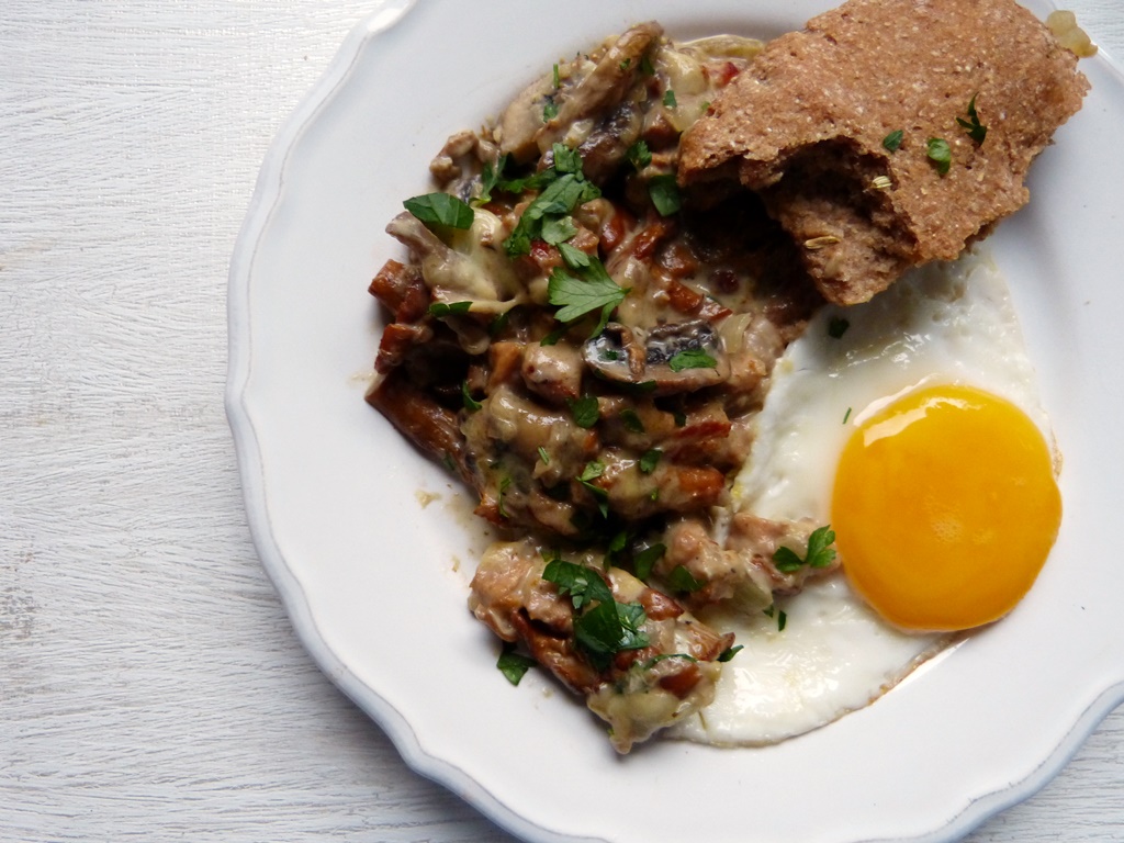 Das Gericht heißt „Champignons auf Savoyer Art“, was etwas verwirrend ist, denn das Original-Rezept verwendet Morcheln. Ich habe auf eine Mischung von Champignons und Pfifferlingen zurückgegriffen. Die Pilze werden mit Zwiebeln gebraten, dazu gesellen sich Schmand und ordentlich Käse. Und serviert wird das Ganze mit einem Spiegelei. Gut und herzhaft.