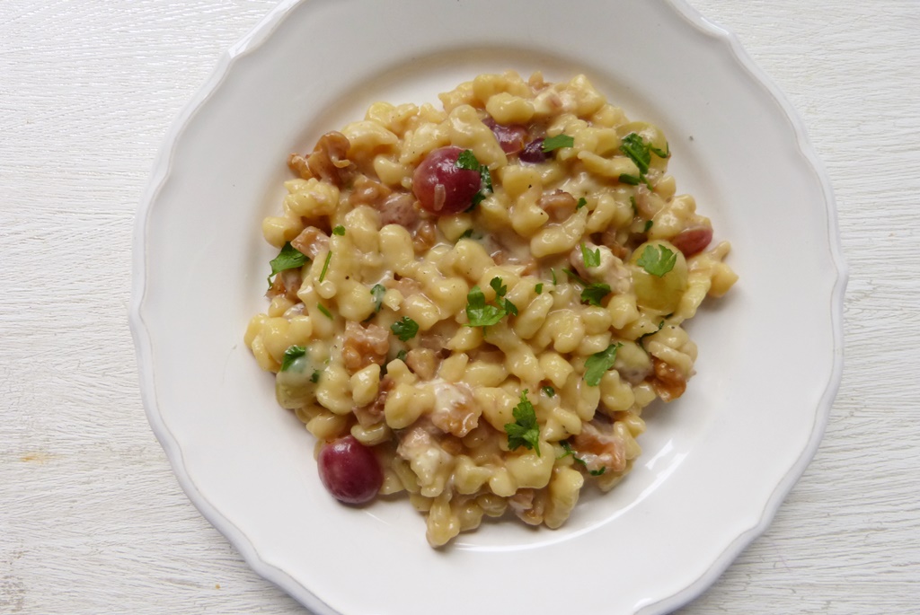 Pizokel sind sozusagen schweizerische Spätzle. Bisher kannte ich nur die dicken Pizzoccheri, die mit Kohl und Käse serviert werden. Diese Variante hier wird durch ein Spätzlesieb gepresst und mit Trauben und Walnüssen serviert. Abgelöscht wird mit einer ordentlichen Menge weißem Balsamico und der Käse der Wahl ist Taleggio. Das ist ein sehr schön ausgewogenes Gericht, das uns richtig begeistert hat. Allerdings ist es auch eine echte Bergsteigerportion.