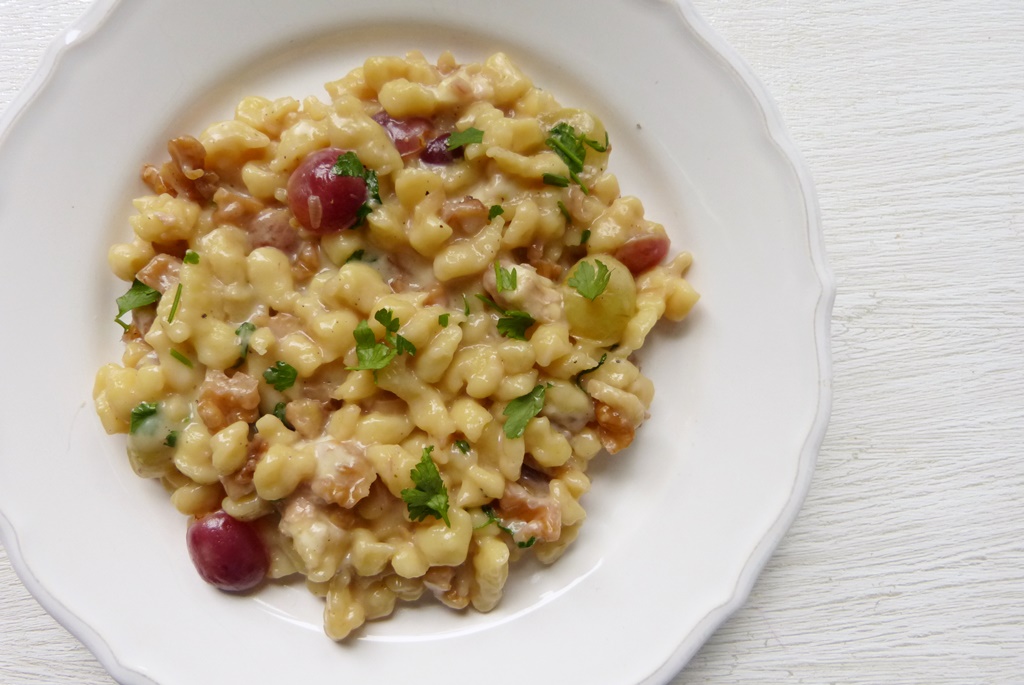 Pizokel habe ich nachgekocht – war sehr, sehr lecker! Die süßlichen Weintrauben mit den Nüssen und den lockeren Spätzle, herrlich. Mein Mann ist nicht für Obst und Nüsse im Hauptessen und hat es mir überlassen, am nächsten Tag – und es war noch genauso gut – es noch einmal geniessen zu können.