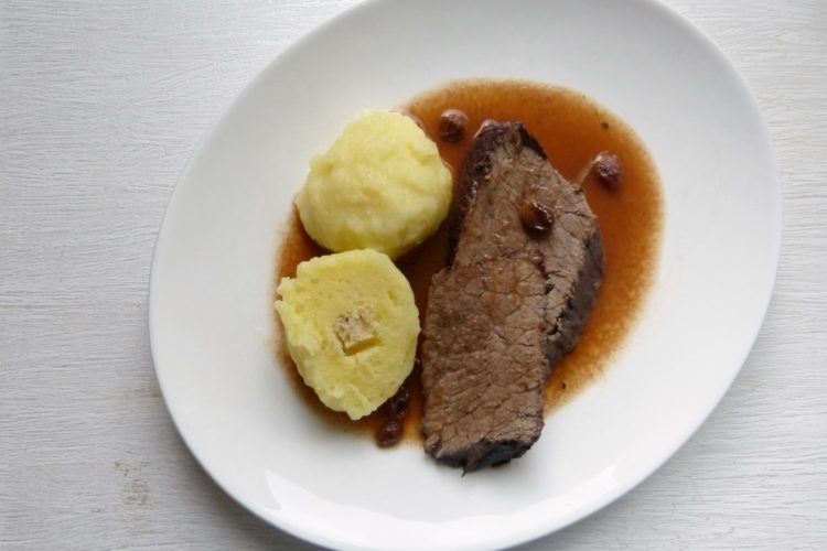 Die jetzige Etappe führt ins Rheinland und nach Westfalen. Interessanterweise fällt mir dazu eine Menge ein…. Töttchen, Miesmuscheln auf Rheinische Art, Himmel und Ääd, Pickert….zum Beispiel. Die Auswahl ist mir aber nicht schwer gefallen. Ich wollte Sauerbraten. Einfach, weil ich den noch nie gemacht habe. Gegessen wohl, aber noch nie gekocht.