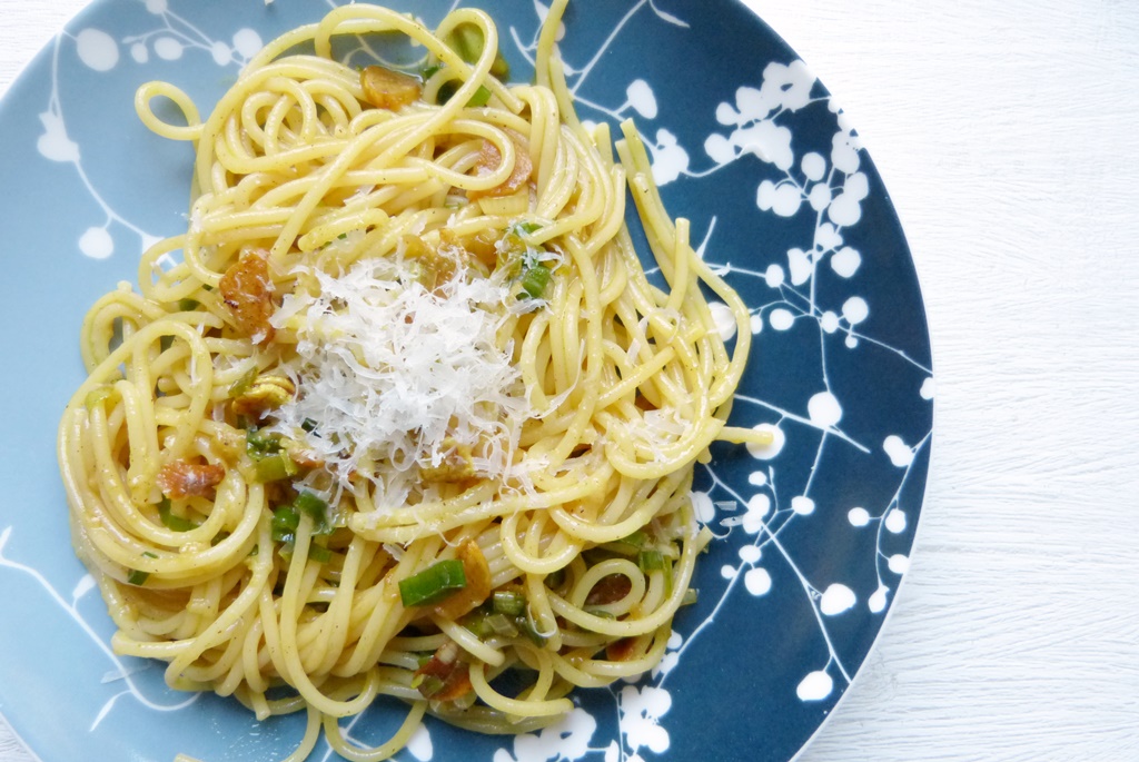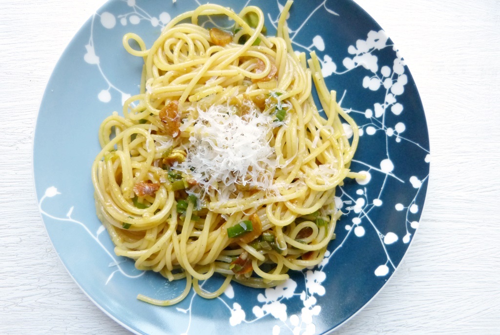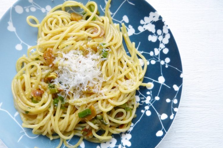 Mit Spaghettini geht das Ganze besonders fix – ich könnte mir aber auch chinesische Eiernudeln gut vorstellen. Oder, wenn man mehr Zeit hat, selbstgemachte Pasta, das schmeckt sicher besonders gut.