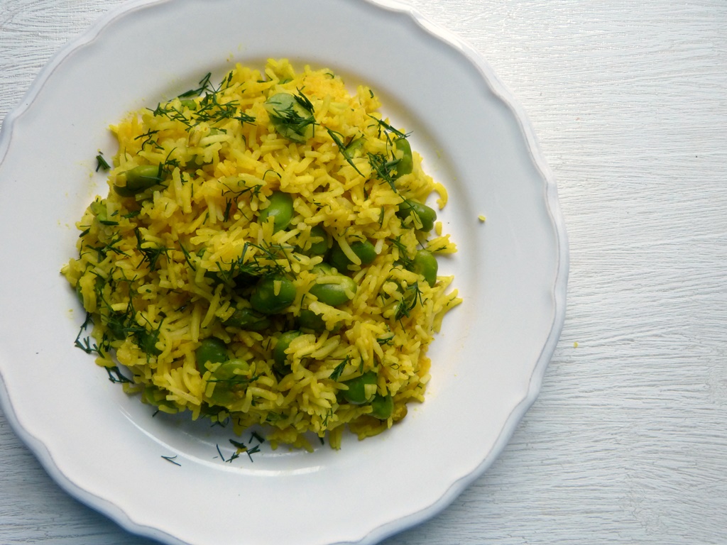 Reis mit Dill und dicken Bohnen aus dem Irak: so ähnlich gab es das hier schon mal – aber mit getrockneten Bohnen. Diese Version stammt aus dem südlichen Irak und wird gerne zu Hochzeiten und Trauerfeiern gekocht. Beigesteuert hat es Barakat Bustan Faraj. Er ist in Basra geboren, lebt seit 2011 in Puchheim und mag die Musik von Oum Kalthoum (Ich auch!).