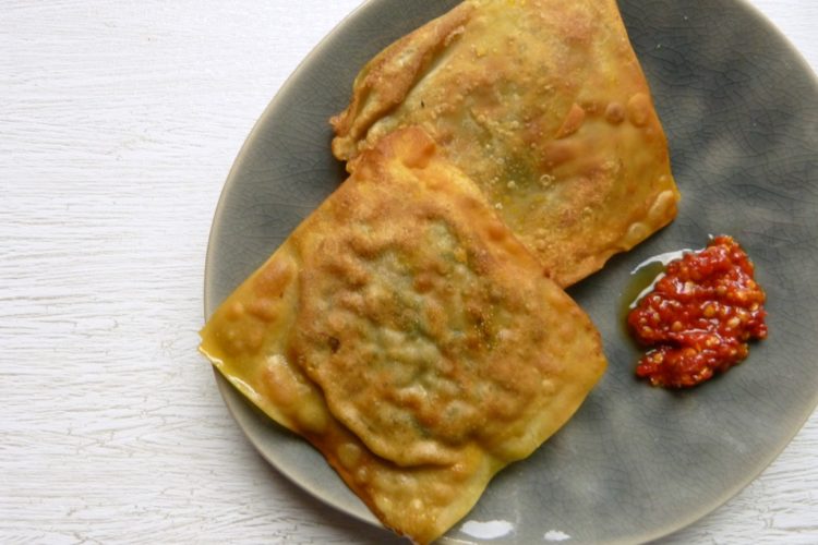 Diese Teigtaschen stehen schon lange auf meiner inneren Nachkochliste, ich konnte mich aber nicht so recht durchringen. Die Originalversion ist nämlich ziemlich arbeitsintensiv, und zwar wegen des Teiges. Im Original wird nämlich ein Roti-Teig so lange ausgezogen, bis er ganz dünn und durchscheinend ist, ähnlich wie bei einem Strudelteig. Dafür war ich bisher noch nicht in der rechten Stimmung.