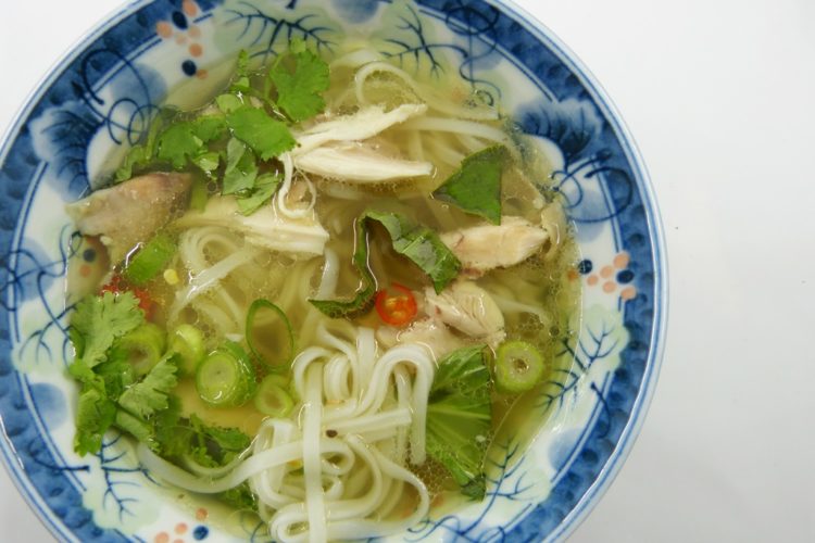 Pho ist ziemlich vielfältig – Basiszutaten sind eine klare Brühe und Reisnudeln, und dann wird es spannend. Klassisch sind Pho mit Hühnchen oder mit Rind; inzwischen gibt es auch vegetarische Varianten. Viele Kräuter gehören dazu, Fischsauce und Limettensaft. Im Norden und Süden Vietnams hat man unterschiedliche Vorstellungen vom Aroma der Suppe: in Süden setzt man auf Röstaromen und stärkere Würzung, im Norden ist man da etwas zurückhaltender.