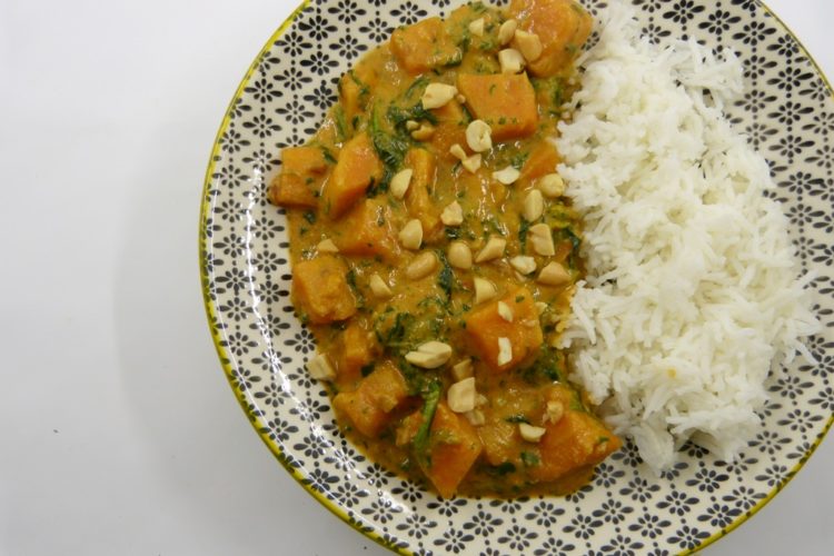 Im Gegensatz zum Originalrezept von BBC Good Food habe ich etwas mehr Erdnussbutter und Currypaste verwendet und außerdem Gemüsebrühe statt Wasser.