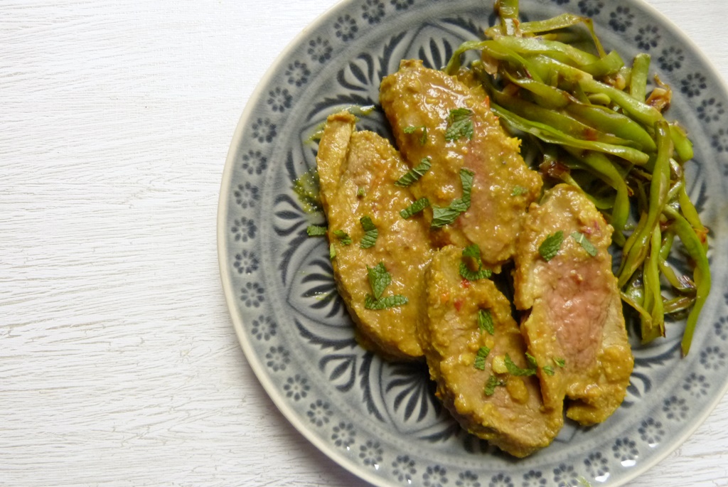 Den Großteil des Fettes aus der Pfanne gießen (aber aufheben, das ist ein tolles Bratfett für z.B. Bratkartoffeln). Pfanne wieder auf mittlere Hitze stellen, einen Löffel der Gewürzpaste hinein geben. Wenn diese zu brutzeln anfängt, die restliche Paste zugeben. Ca. 5 min unter Rühren anrösten, bis alles etwas dunkler wird und zu duften beginnt.