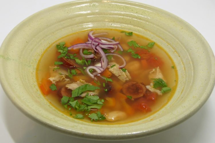 Die Suppe ist relativ deftig; die Brühe basiert auf Schweineknochen; ich hatte Spareribs und habe, anders als im Rezept, auch noch deren Fleisch in die Suppe geben. Dazu kommen weiße Bohnen, etwas Gemüse und ein Topping aus rasch eingelegten roten Zwiebeln. Das hat uns sehr gut gefallen.