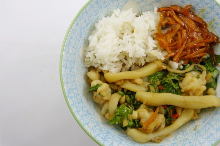 Ich reise ja weiterhin gerne auf dem Teller, und heute geht es mal wieder nach Taiwan. Das „drei Tassen“ im Rezepttitel kommt eigentlich von einem anderen taiwanesischen Essen, dem „Drei-Tassen-Hühnchen“. Die drei Tassen beziehen sich auf die Sauce, die zu gleichen Teilen aus Sesamöl, Reiswein und Sojasauce besteht. Die Ausdrucksweise kommt daher, dass Rezepte in Taiwan früher mündlich weitergegeben wurden.