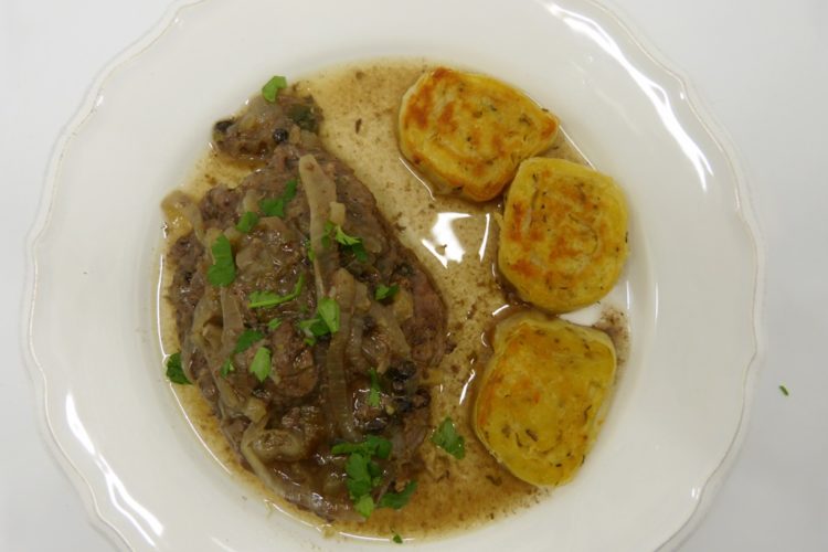 Lorbeer und Nelken vor dem Servieren herausfischen und das Fleisch mit Zwiebeln, Sauce und Kartoffelroulade auf Tellern anrichten.