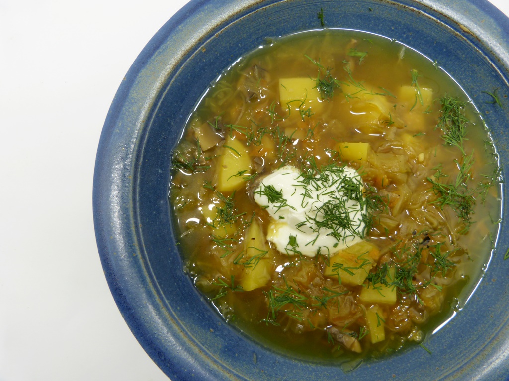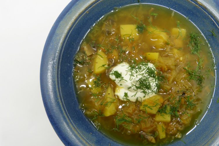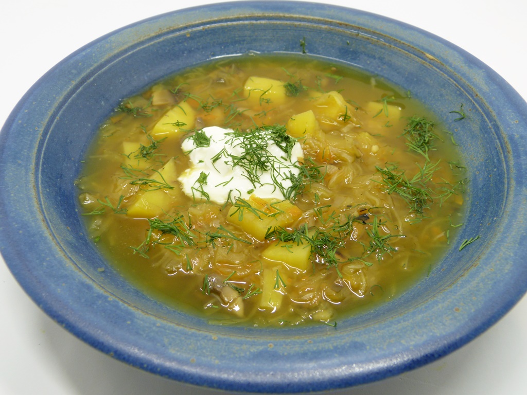 Diese Variante hier kommt von Alissa Timoshkina*. Natürlich ist Sauerkraut drin, aber auch Kartoffeln, etwas Karotte und statt Fleisch werden Pilze verwendet. Die Suppe ist ein toller Bauchwärmer im Winter, wird im Sommer aber auch gerne kalt gegessen. Man kann ruhig eine große Portion davon kochen – die Suppe hält sich im Kühlschrank ein paar Tage, und sie schmeckt um so besser, wenn sie etwas durchziehen konnte.