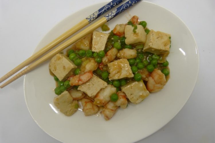 Jetzt geht es schnell: einen Wok erhitzen und das Öl hineingeben. Ingwer und Frühlingszwiebel unter Rühren kurz braten, dann Garnelen zugeben, kurz rühren, dann die Saucenmischung angießen. Wenn die Garnelen die Farbe verändern, die Garnelenbrühe angießen, Tofu und Erbsen zugeben und alles mit aufgelegtem Deckel 3 min köcheln lassen.