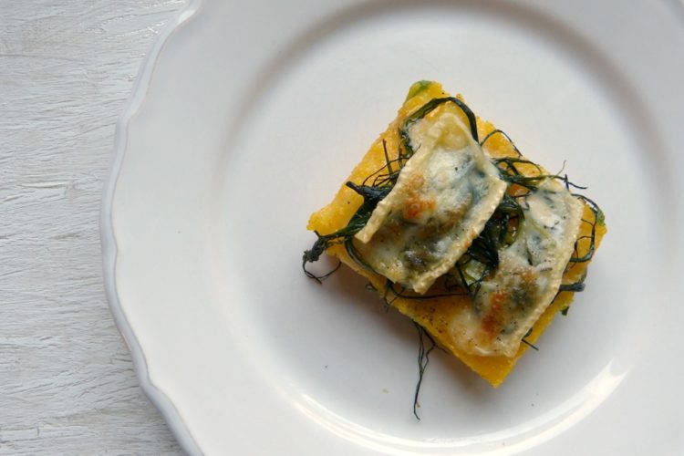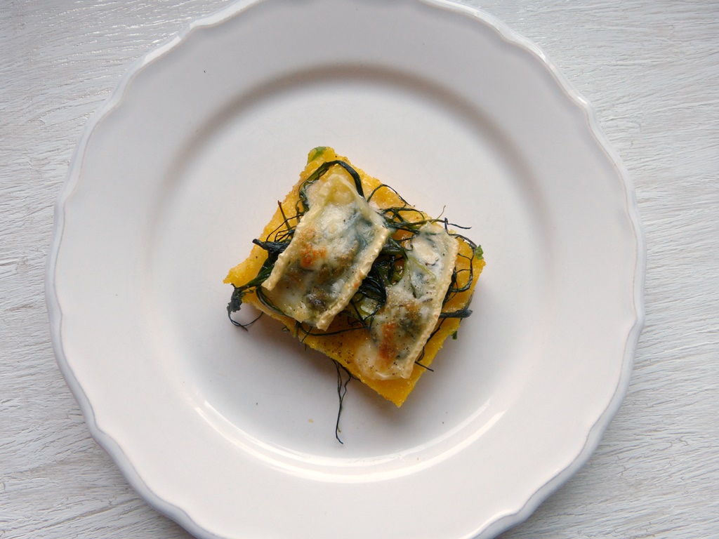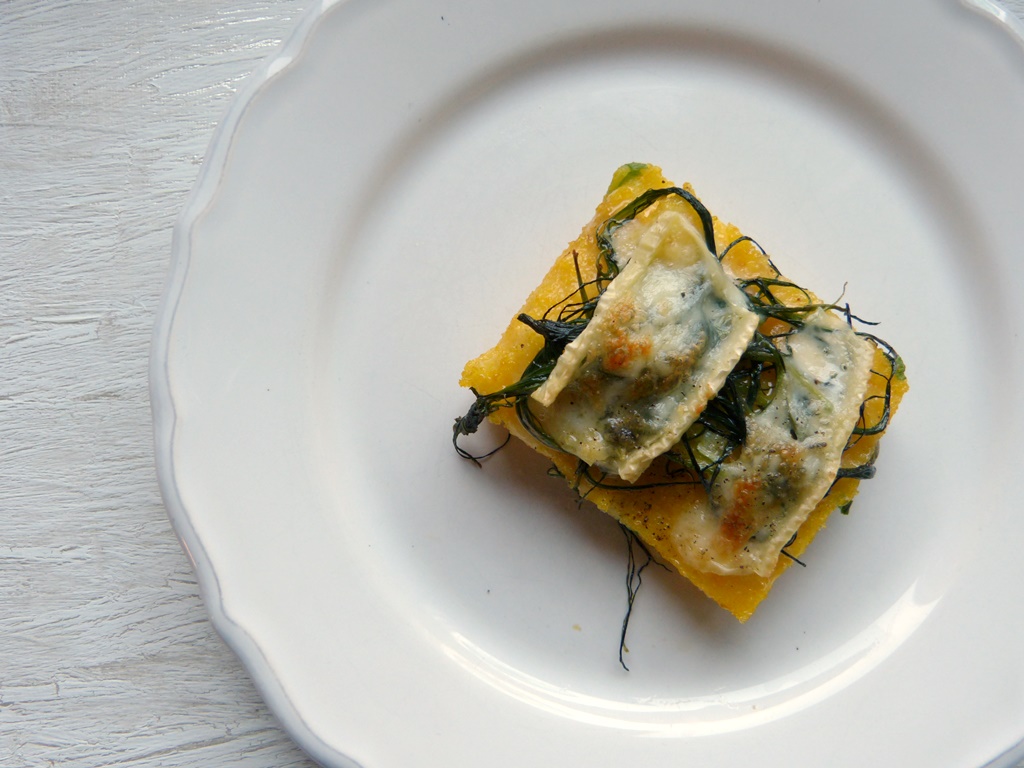 Ich mag jedenfalls beides und ich fand die Idee spannend, Mönchsbart mit Käse zu überbacken. Das konnte ich mir ehrlich gesagt nicht so recht vorstellen, aber es passt wunderbar: leicht zwiebelige Polenta-Schnitten, salziger Mönchsbart und zart schmelzender Käse.