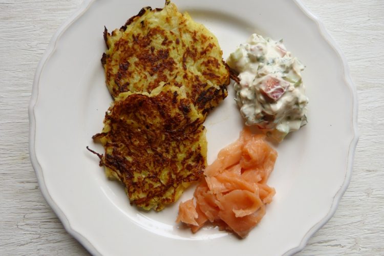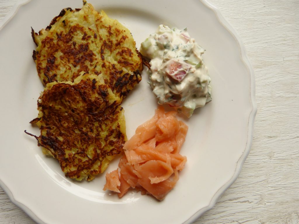 Zum Servieren die Puffer mit etwas Lachs und etwas Quark auf Tellern anrichten.