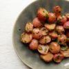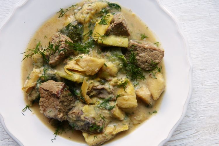 Die Rezeptidee kommt von Vefa Alexiadou*. Ich glaube, das Buch ist so ziemlich das umfangreichste über die griechichische Küche, das man finden kann; ich stöbere sehr gerne darin. Für alle, die englischsprachige Bücher nicht so mögen – im Herbst erscheint endlich eine deutsche Ausgabe* des Buches. Im Original heißt das Rezept „Lammragout mit Artischocken ODER Zucchini“, das habe ich nicht ganz eingesehen, ich wollte beides. Ihr könnt Euch natürlich auf ein Gemüse festlegen, dann einfach die Menge des jeweiligen Gemüses verdoppeln.