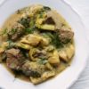 10 min vor Ende der Garzeit das Fleisch auf die Linsenmischung legen und alles zusammen weiter garen.