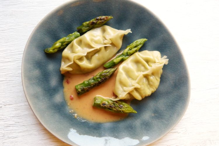 Ein bisschen was habe ich geändert – ich habe Potstickers aus dem Ganzen gemacht, weil ich finde, dass Röstaromen dem Spargel gut stehen; und ich habe auch nur Spargel verwendet; damit war mein Bund dann aufgebraucht.