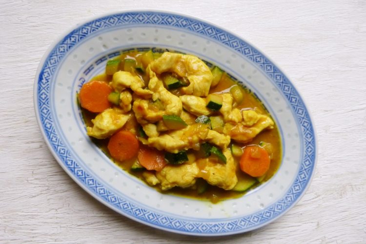 Dieses hier gehört zur letzten Kategorie – es ist ein amerikanisches Takaway-Gericht. Nur halt zum Selbermachen. Im englischen Sprachraum wurde dafür übrigens im Verlauf des letzten Jahres der Begriff „Fakeaway“ geschaffen, es gibt da ganze Kochbücher mit „Fakeaway“-Gerichten. Gut, das hier habe ich bei einem meiner sino-amerikanischen Lieblingsblogs gefunden. Es ist fix und einfach gemacht – schneller als bestellt und geliefert und /oder geholt. Die Mischung der Aromen ist super – Currypulver und Kurkuma, und für Süße und Umami sorgt Austernsauce.