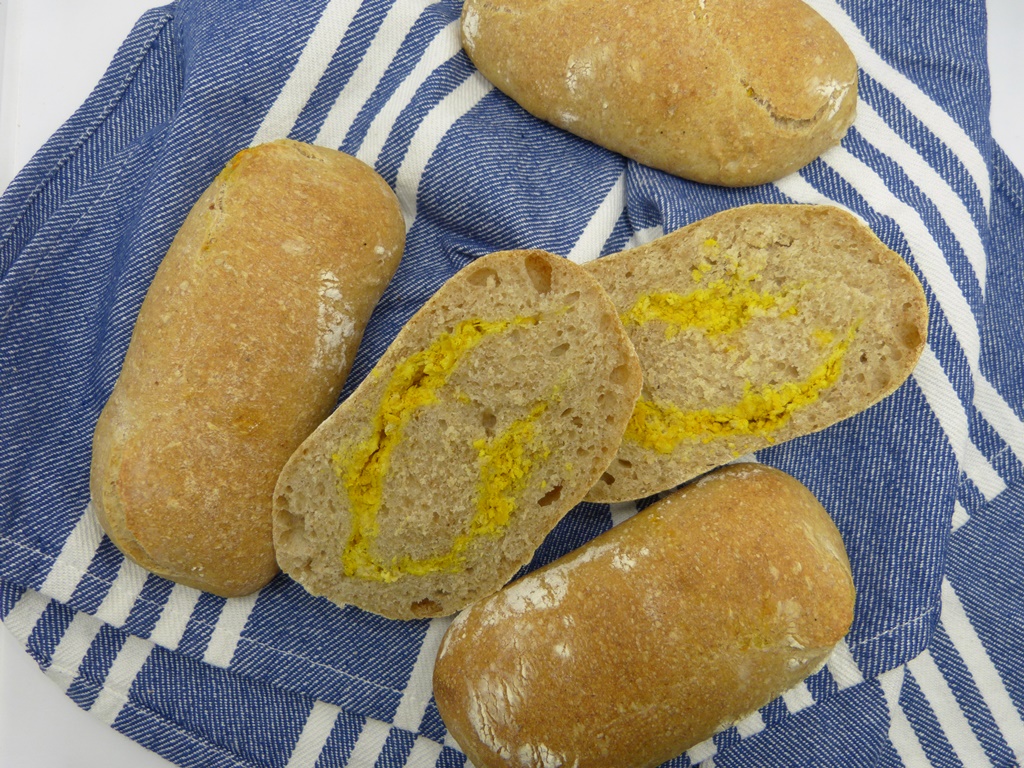 So wie diese Brötchen hier, die ich in einer Ausgabe des Brot-Magazins gefunden habe. Die Idee einer Füllung hat mir gut gefallen. Die Brötchen sind mit Hefe und Sauerteig getrieben und dank langer Gare schön aromatisch. Sie sind allerdings nichts für ein süßes Frühstück, dank Linsen und Kurkuma sind sie eher deftig. Ich könnte mir auch gut vorstellen, sie zu einer Suppe oder einem Eintopf zu servieren.
