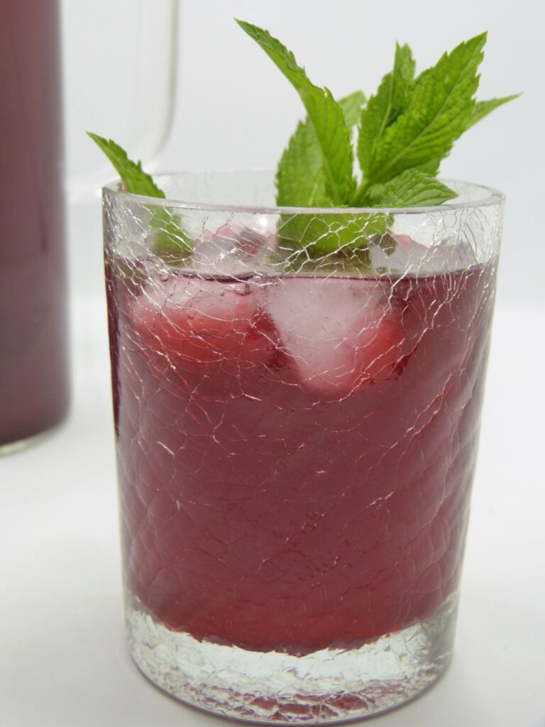Das ist Hibiskustee, der abgekühlt mit Minze und Granatapfelsaft durchzieht und dann auf Eis serviert wird. Sehr erfrischend!
