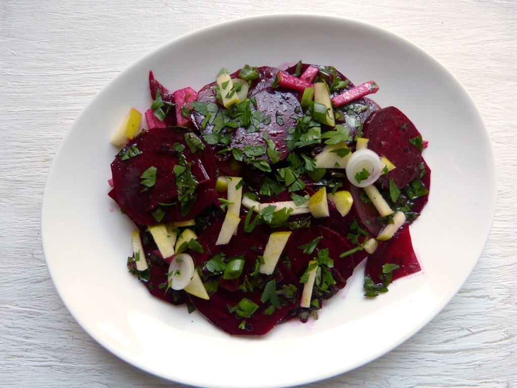 Zu den Knödeln gab es Salat aus im Ofen gebackener Roter Bete mit Apfel und Frühlingszwiebeln. Der hat uns nicht so begeistert – die Roten Bete waren nicht gar und das Dressing sehr ölig.