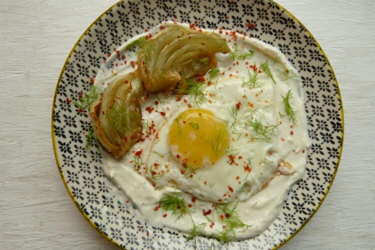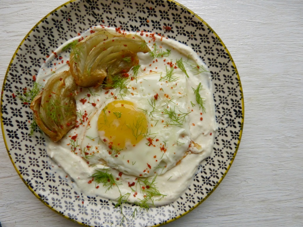 Das Rezept kommt aus Ekatarina Paraschiv-Poirsons Buch über die Küche des Balkans*, und sie hat dem Ganzen einen eigenen Dreh gegeben – der uns gut gefallen hat. Das Knoblauchjoghurt ist klassisch, aber statt pochierter Eier gibt es Spiegeleier dazu. Was ich gut finde, weil es dann unterschiedliche Konsistenzen gibt.