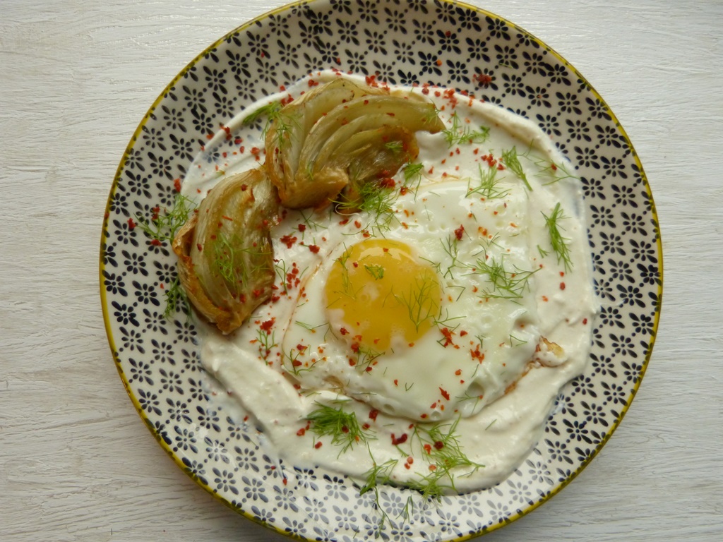 Zum Servieren jeweils etwas Joghurtsauce auf Teller verteilen. Ei darauf platzieren, etwas Fenchel daneben legen und mit Dillspitzen bestreut servieren.