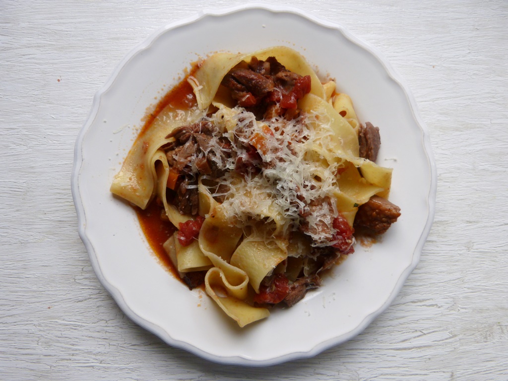 Die Toskana ist nicht gerade die Pasta-Region schlechthin, aber Pappardelle sind typisch toskanisch. Gegessen werden sie am liebsten mit kräftigen Fleischsaucen – genau meins. Das hier ist ein Ragù mit Entenschenkeln. Der leichte Wildgeschmack passt gut zu den robusten Nudeln.