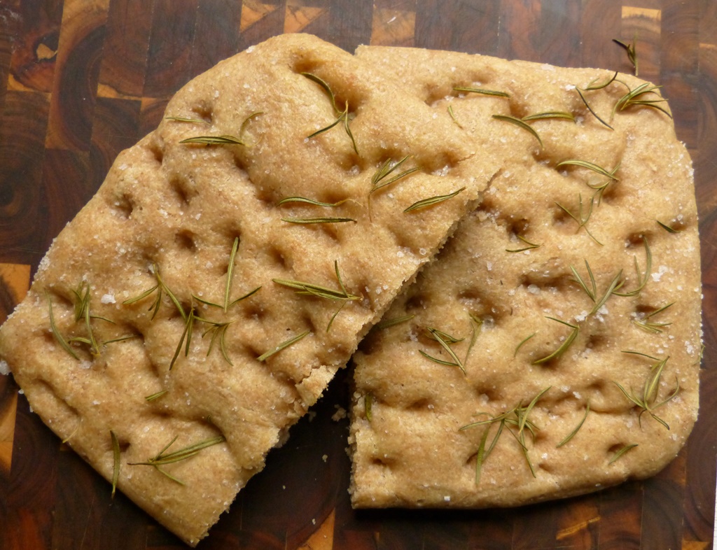 Die Schiacciata ist das Gegenstück zur bekannteren Foccacia; hier als ganz schlichtes Brot einfach nur mit Olivenöl und Rosmarin. Das hier ist ein einfaches No-Knead-Rezept mit wenig Hefe und langer Teiggare, das uns sehr gut geschmeckt hat. In der Toskana wird viel Farro, also Emmer verwendet, auch für dieses Fladenbrot. Ich habe „nur“ ganze Körner bekommen und habe das Vollkornmehl mit Dinkel 630 gemischt, daher die braune Farbe.