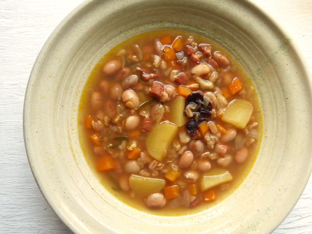 Es wird viel Emmer gegessen in der Toskana – er wird nicht nur zum Backen verwendet, sondern landet zum Beispiel auch in Suppen und Eintöpfen. Diese Suppe aus Bohnen, Emmer, etwas Karotte und Kartoffeln entwickelt beim Köcheln auf dem Herd einen harmonischen Geschmack, ist sättigend und nicht zu schwer. Getrocknete Pflaumen bringen eine leichte Süße mit, das hat uns gut gefallen.