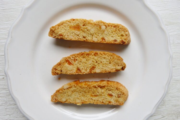 Mehl, Backpulver und Salz in einer Schüssel vermischen, dann ein Eigelb, die Eiweißmischung und das Olivenöl zugeben und alles gut verkneten. Zum Schluss Orangenschale, Aprikosen und Pinienkerne einarbeiten und den Teig für 30 min im Kühlschrank ruhen lassen.