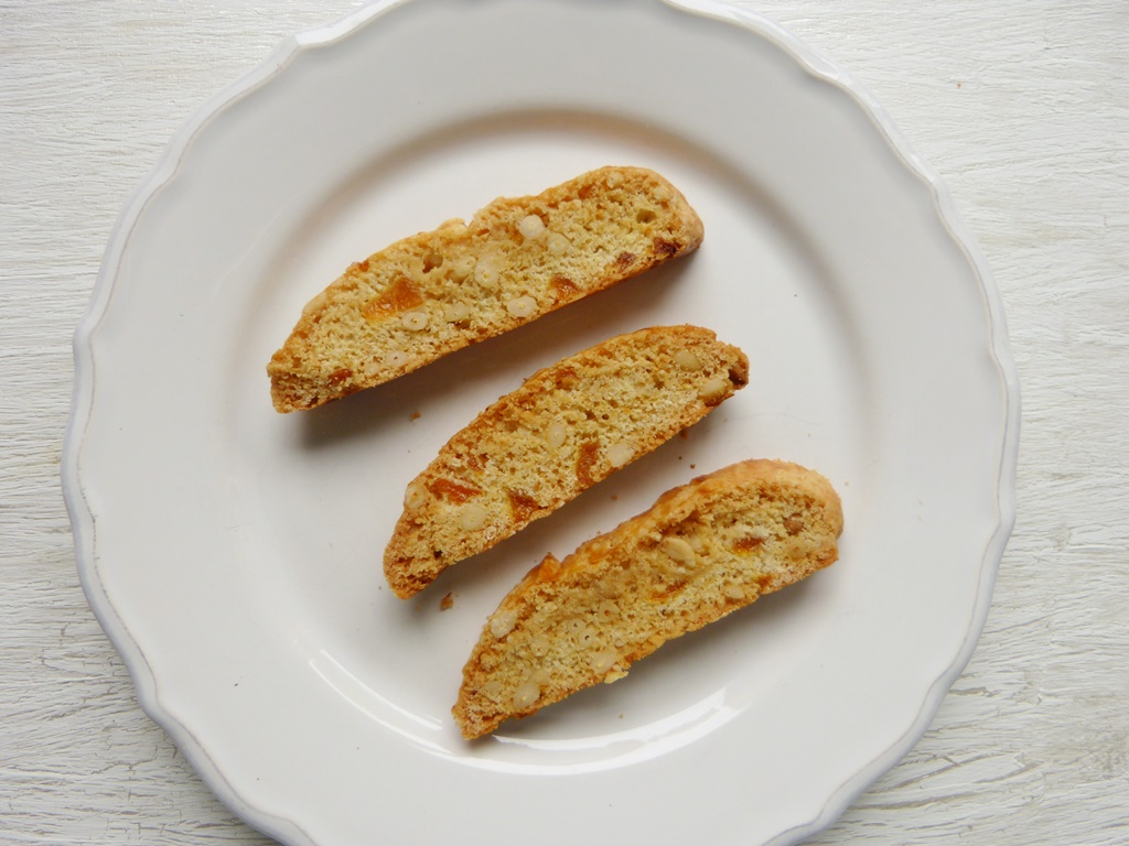 Cantucci mag ich ohnehin sehr gerne, und diese hier aus Cettina Vicenzinos Toskana-Kochbuch* haben mir besonders gut gefallen: statt der üblichen Mandeln werden sie mit Pinienkernen gemacht, außerdem sind getrocknete Aprikosen drin. Und der Clou ist das Fünf-Gewürz-Pulver, das gibt so ein tolles Aroma.