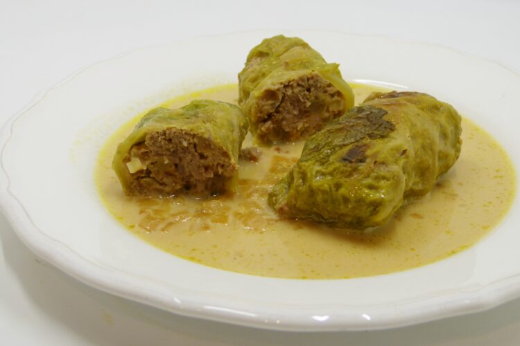 Petra Kolip*, von der das Rezept stammt, nennt sie „norddeutsche Wirsingrouladen“. Warum, weiß ich nicht, vielleicht wegen der leichten Süße des Apfels in der Füllung. Im Original ist außerdem noch Knollensellerie drin; ich habe statt dessen Staudensellerie verwendet, davon hatte ich noch so viel.