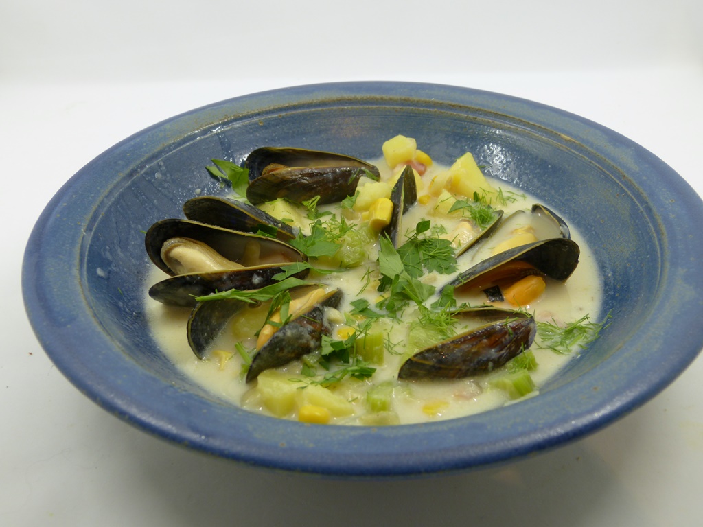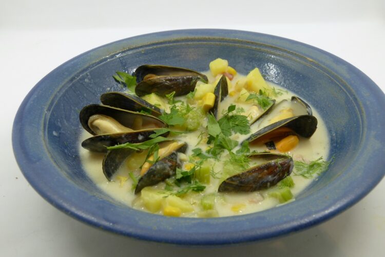 Clam Chowder wollte ich schon sehr langen machen, allein, mir fehlten die großen Venusmuscheln (Quahogs oder Clams). Die gibt es an der amerikanischen Ostküste. Gabis Hinweis in „American Christmas„*, dass man die Suppe auch mit Miesmuscheln oder sogar mit Fischfilet zubereiten kann, hat mich also direkt in die Küche geschickt.