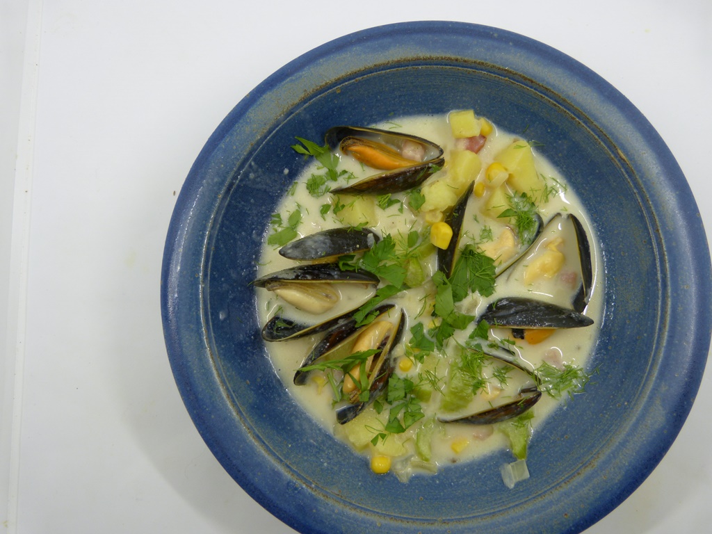 Die erste Fish Chowder wurde wohl mit Kabeljau zubereitet – Muscheln sind natürlich toller, finde ich jedenfalls. Die Suppe ist recht üppig – Speck ist drin, Kartoffeln und Mais. Gebunden wird mit Mehl und die cremige Konsistenz kommt von Milch und Sahne. Wir haben den Chowder mit etwas Baguette als Hauptmahlzeit gegessen; das ist nicht ganz stilecht, eigentlich bräuchte man Oyster Crackers.