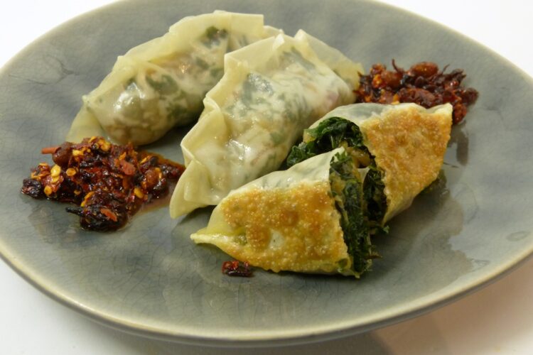 Es war Grünkohl in der Abokiste, und auf die traditonelle Zubereitung hatte ich keine Lust. Außerdem hatte ich noch Dumplinghüllen in der Tiefkühle, die endlich weg mussten; sie waren schon etwas spröde. Die Idee, Grünkohl zusammen mit Speck in Teigtaschen zu packen, habe ich bei Kristina Cho* gefunden – und sie hat uns restlos überzeugt.
