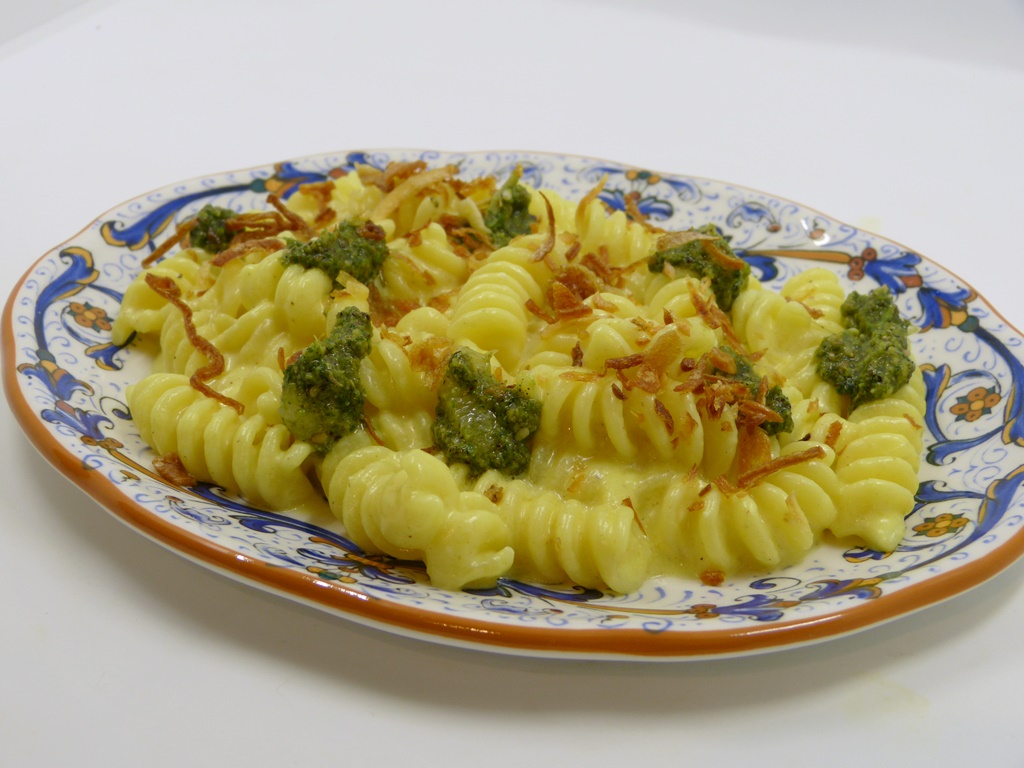 Meine Vorliebe für Mac’n Cheese ist ja bekannt – und diese Variante ist großartig. In der Käsesauce stecken Kurkuma, Knoblauch, Kreuzkümmel, Cheddar und Feta. Dazu gibt es Pesto mit Za’atar, Koriander und Zitrone und als zusätzliches Topping Röstzwiebeln.