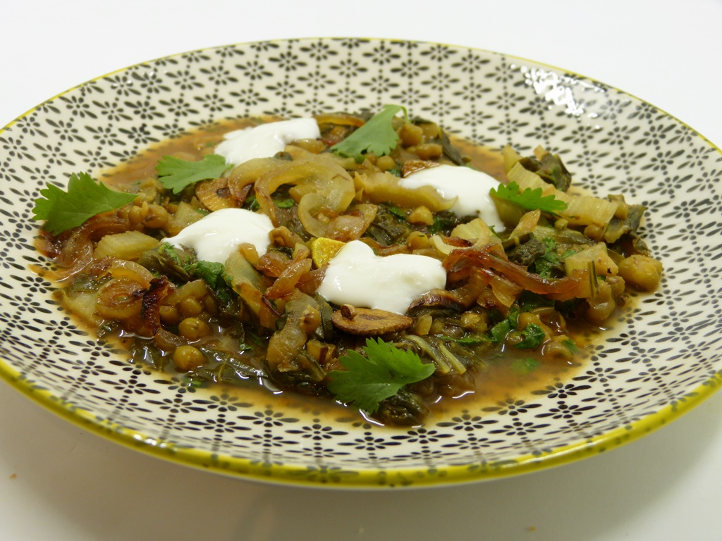Mungbohnen mit Blattgemüse und Kurkuma-Öl – ein adaptiertes Rezept persischen Ursprungs, an dem mir besonders die frische Säure der Tamarinde gefallen hat. Und der Ursprung meiner Mungbohnen ist tatsächlich „oberstes Regal, ganz hinten“….