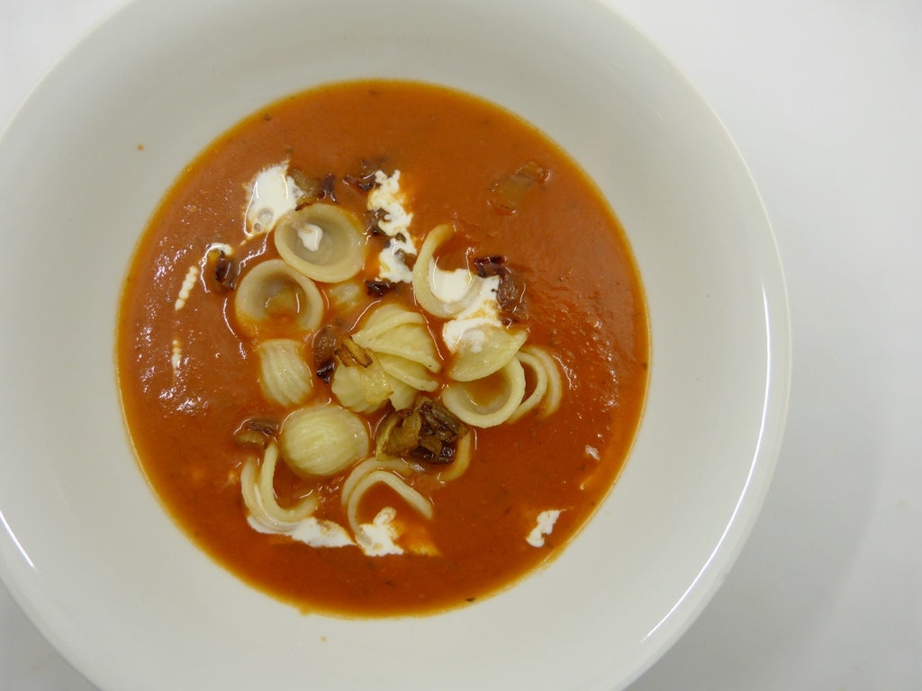 Tomatensuppe, serviert mit in reichlich Butter braun gebratenen Zwiebeln, gegarten Orecchiette und Sahne – sehr fein.