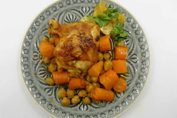 Karotten schälen und in ca. 5 cm langen Stücke schneiden und zusammen mit den Kichererbsen in die Form geben. Hühnchen mit der Hautseite nach oben dazu geben. Form abdecken und für 30 min in den Ofen stellen, dann weitere 40 min offen garen.