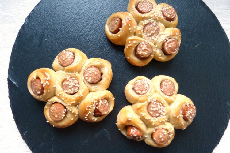 Nun je einen Ball zu einem 7 cm breiten Rechteck ausrollen, dass so lang ist, das ein Hotdog-Würstchen der Länge nach hineinpasst. Ein Würstchen in die Mitte legen, den Teig der Länge nach darüber falten und die Naht gut festdrücken. Dann in 6 gleich große Stücke schneiden. Nun auf dem Blech zu kleinen Blumen auslegen: dazu ein Stück in die Mitte geben und 5 andere aussen herum arrangieren. So weiter machen, bis Teig und Würstchen aufgebraucht sind, dann abgedeckt ca. 45 min ruhen lassen.