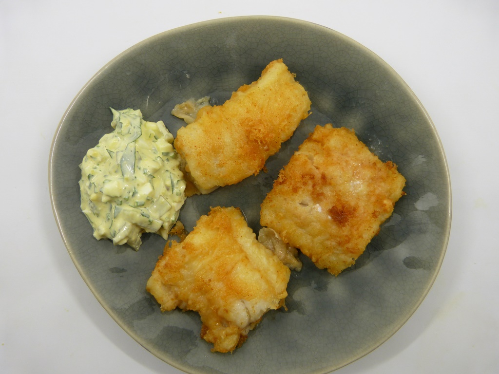 Der Backfisch im Bierteig mit Sauce Gribiche ist sozusagen der Fischteil von Fish and Chips – und weitaus besser als das, was ich in Großbritannien serviert bekommen habe. Joshua Weissman findet Pommes frites dazu überflüssig, wir hatten trotzdem welche dazu.
