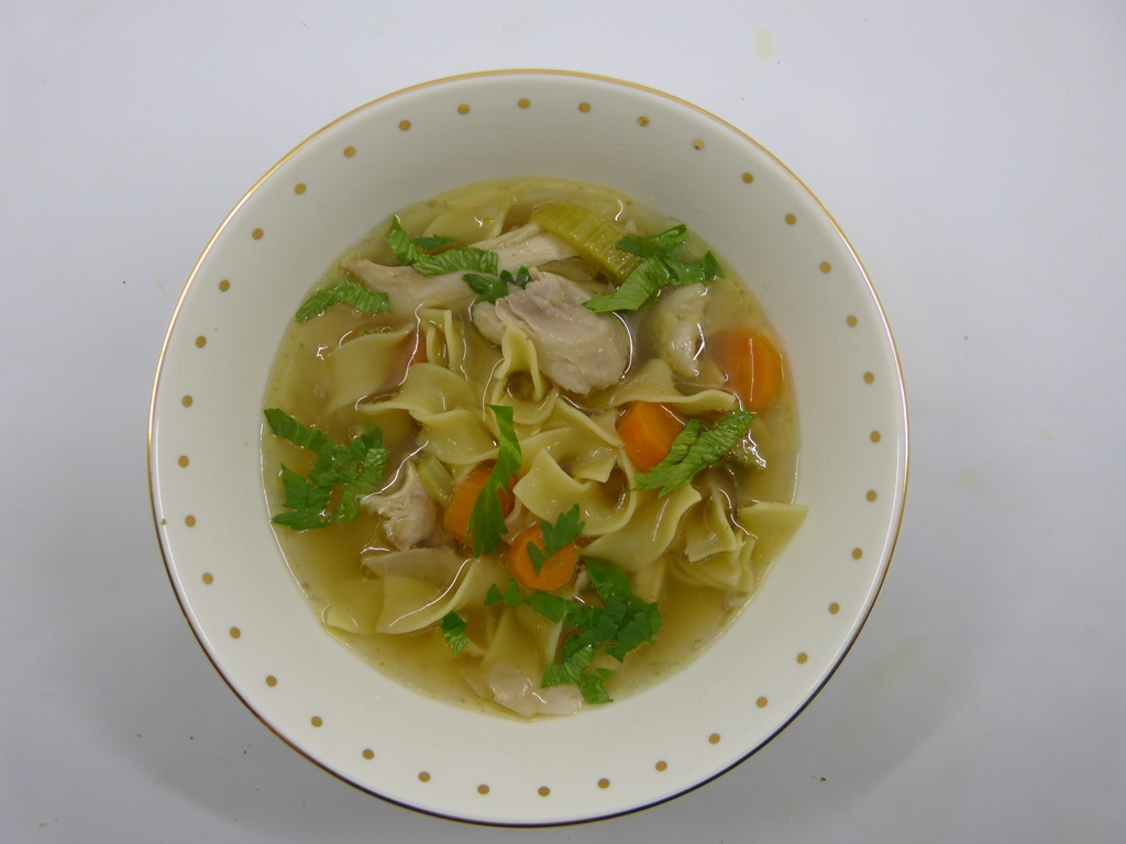 Hühnersuppe, Mom’s Hühnersuppe genaugenommen. Es ist ein Twist dabei: für die Suppe wird zunächst eine Hühnerbrühe aus Karkassen aus dem Kapitel mit den Grundrezepten gekocht, und in dieser Brühe wird dann das Huhn gekocht, das in der eigentlichen Suppe landet. Und auch die Nudeln werden in Hühnerbrühe gegart – mehr Aroma geht kaum.