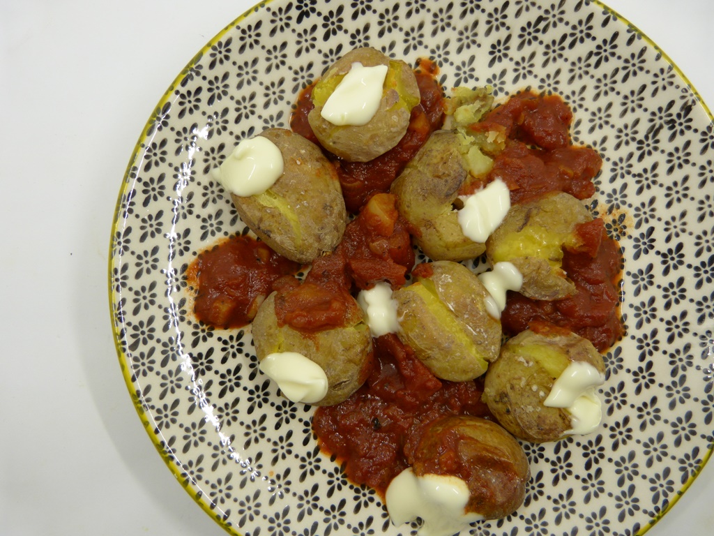 Zum Hühnchen haben wir Patatas Bravas gegessen – diese Kartoffeln in scharfer Tomatensauce wollte ich schon lange ausprobieren. Hier kommen sie mit einem Twist, oder eher zwei: sie werden als Smashed Potatoes serviert, die Kartoffeln werden erst gegart, dann angedrückt und im Ofen knusprig gebacken. Und abgerundet wird alles mit einem Klecks selbstgemachter Mayonnaise.