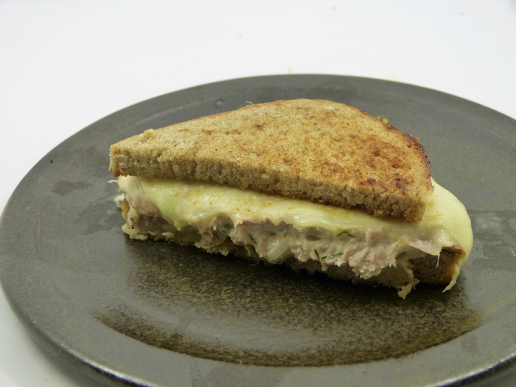Butter in einer Pfanne aufschäumen und die Brotscheiben darin in 2 bis 3 min goldbraun rösten, dann wenden und die andere Seite ebenfalls goldbraun rösten. Eine Brotscheibe mit der Thunfischmischung bestreichen und mit dem Käse bedecken. Unter dem Backofengrill gratinieren, dann die zweite Scheiben Brot auflegen und etwas festdrücken.