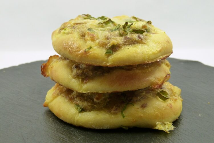 Neulich gab es hier ja Tuna Melt, und das hier erinnert ein wenig daran – kleine Teigfladen mit einem Belag aus Thunfisch, Mayonnaise, Frühlingszwiebeln und Mozzarella. Die Buns haben uns gut gefallen – der Thunfischbelag gewinnt durch die Frühlingszwiebeln sehr, die Mayo sorgt für Cremigkeit und der Käse knuspert an den Rändern etwas auf.
