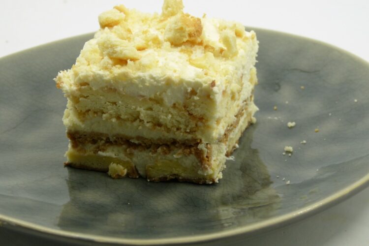 Den Boden der Form mit einer Lage Kekse auslegen, darauf ein Drittel der Creme verteilen. Den Vorgang noch zweimal wiederholen und mit einer Schicht Creme abschließen. Die Form mit Frischhaltefolie abdecken und für mindestens 12 h in den Kühlschrank stellen.