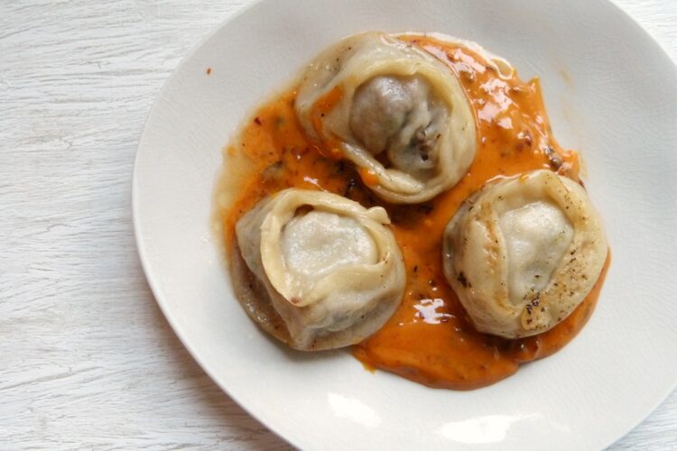 Zum Servieren die Sauce auf Teller oder Schalen verteilen und die Teigtaschen darauf platzieren.