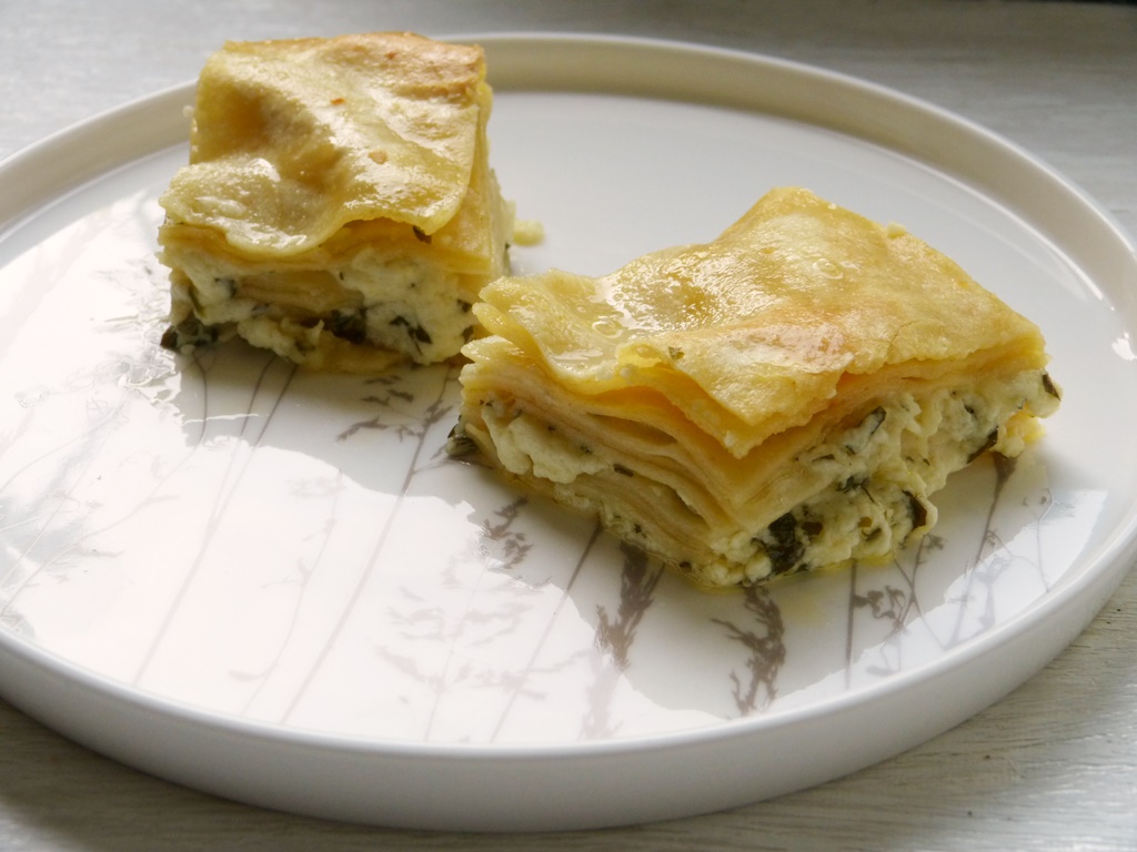 Das ist Börek aus Nudelteig (Wasserbörek, Su Böreği). Dauert auch ein wenig und ist ein richtiges Festessen: Nudelteigplatten werden blanchiert, in eine Form geschichtet, mit Butter bepinselt und mit Weißkäse und Petersilie gefüllt. Die Börek ist innen saftig und außen knusprig und lohnt den Aufwand.