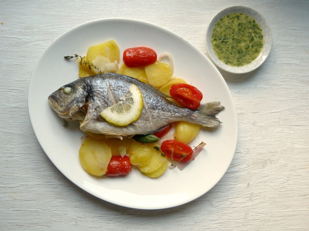 Die Dorade aus dem Ofen ist ein Vorschlag für Silvester. Der Fisch wird mit Zwiebel, Knoblauch, Zitrone und Thymian gefüllt und gart unkompliziert auf einem Gemüsebett im Ofen. Besonders gut gefallen hat uns die dazu servierte Sauce, für die Zitronensaft, Olivenöl, Petersilie und Knoblauch püriert werden.